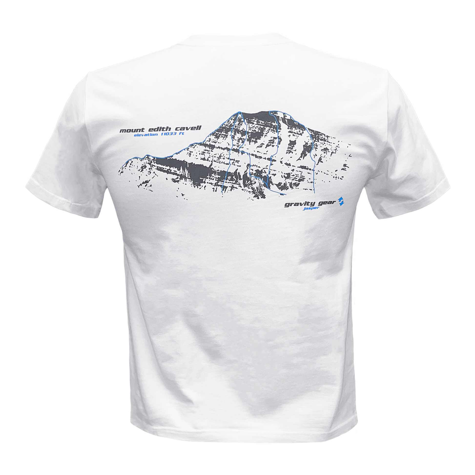 The Gravity Gear Cavell Classic Tee showcases a detailed Cavell Mountain graphic, outlined with climbing routes. On the front is the iconic Gravity Gear arrows with a clean, minimalist look. Made from soft, 100% cotton.