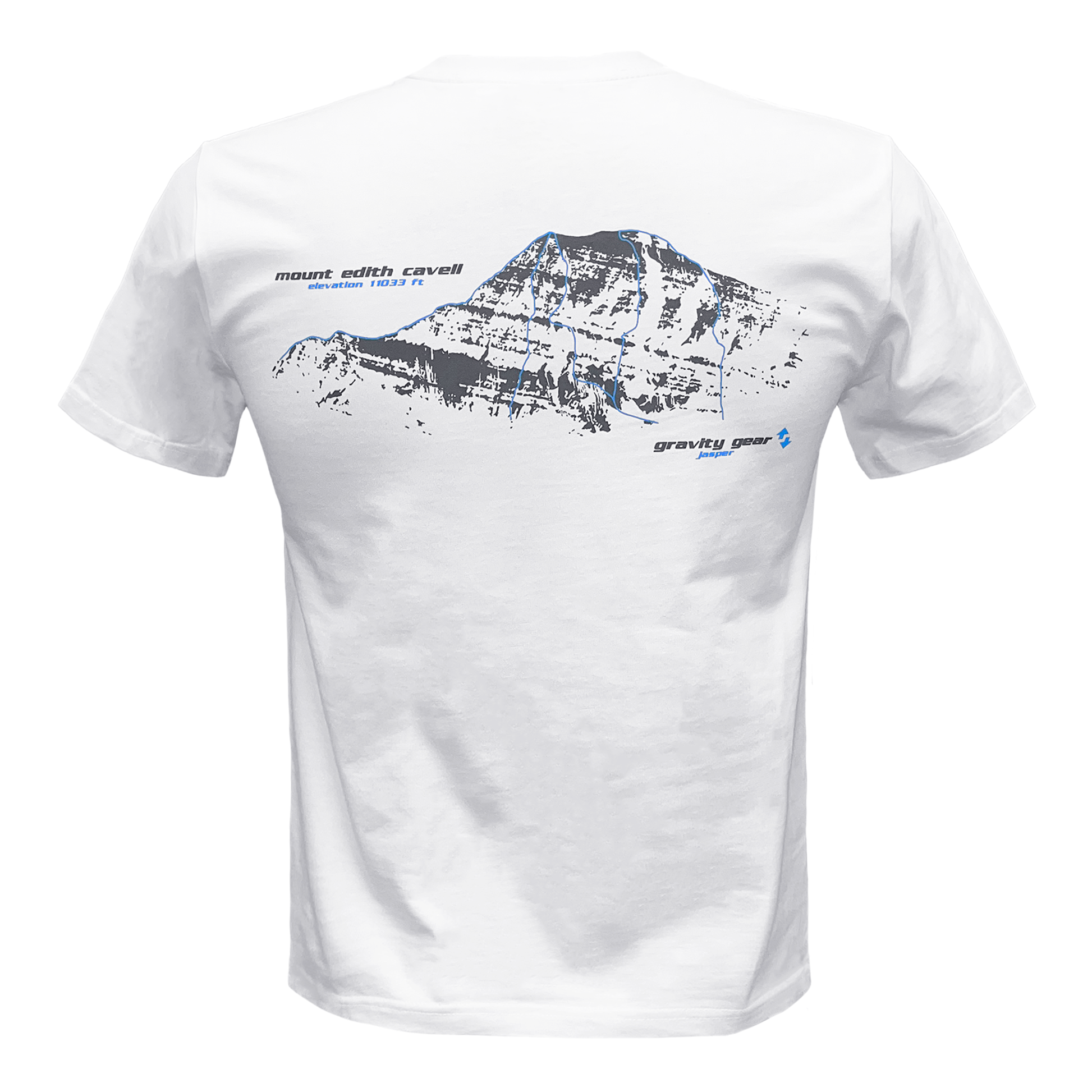 The Gravity Gear Cavell Classic Tee showcases a detailed Cavell Mountain graphic, outlined with climbing routes. On the front is the iconic Gravity Gear arrows with a clean, minimalist look. Made from soft, 100% cotton.