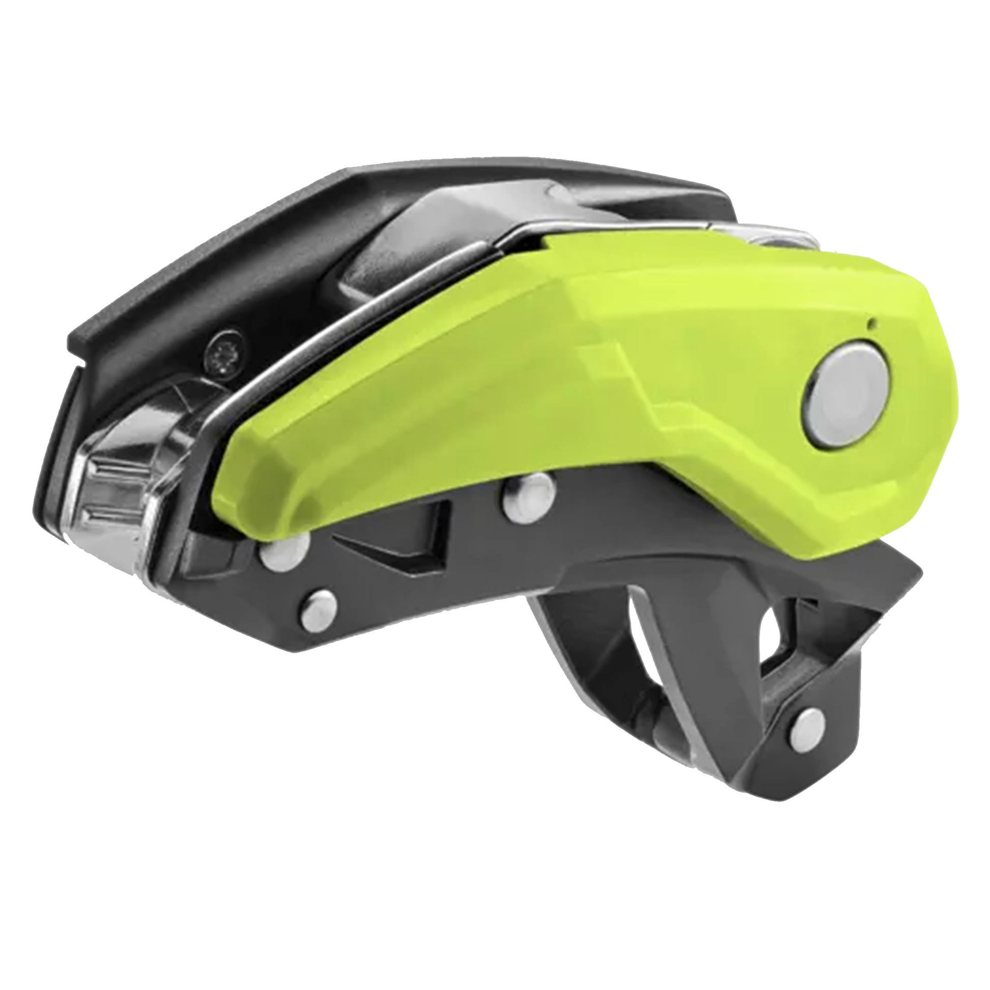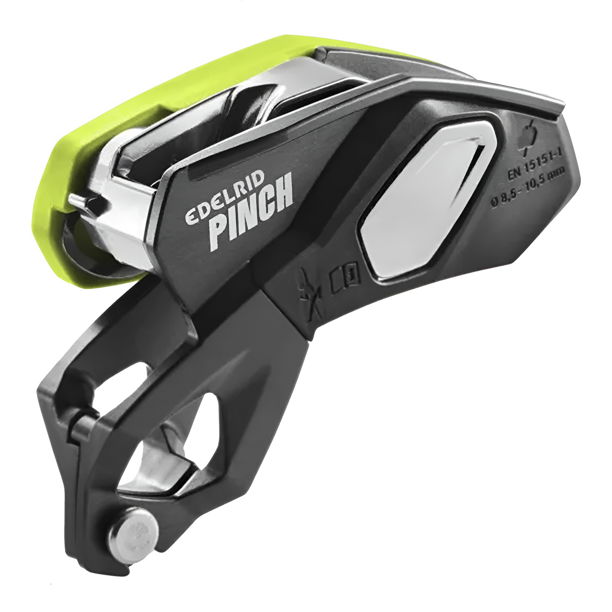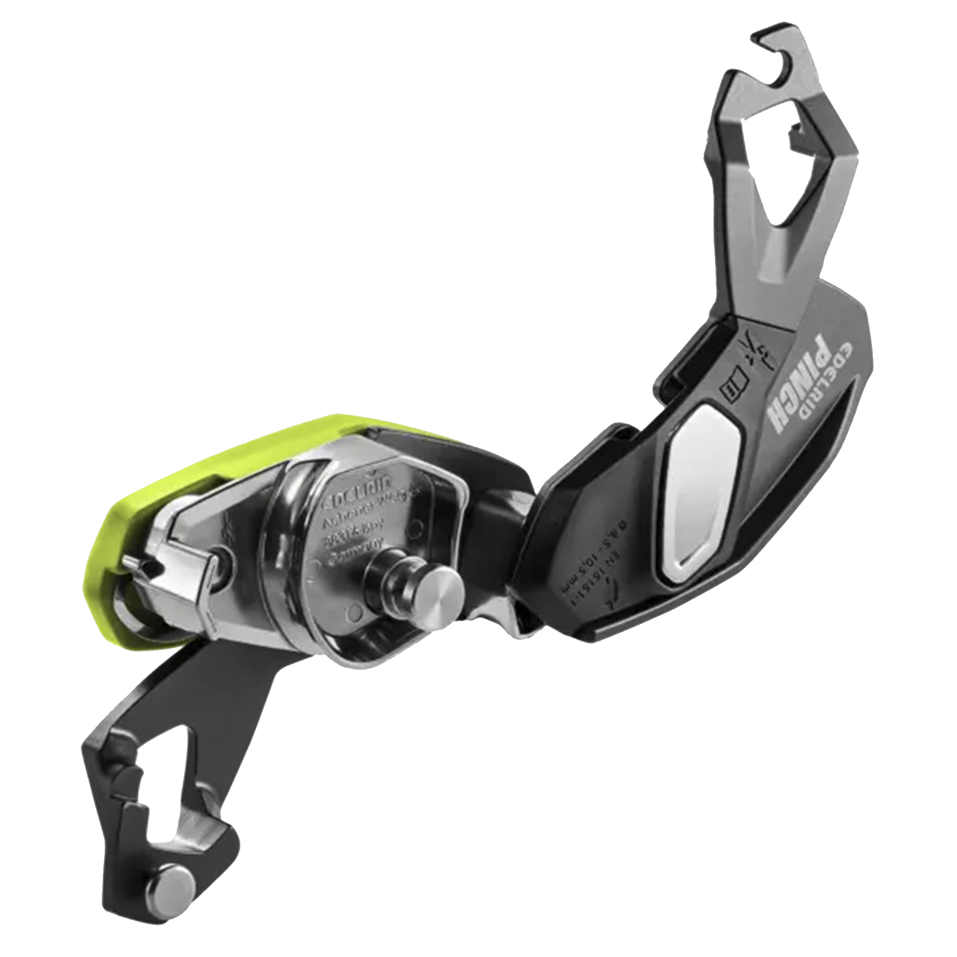 The frontal steel braking grooves ensure a linear rope path, reducing rope twist while lowering and abseiling. The anti-panic function enhances safety by preventing uncontrolled descents, while an integrated second braking tier enables precise control when belaying lighter climbers or handling increased rope friction. Additionally, the Pinch is the only device that can be mounted at the belay station in four different directions, ensuring optimal lever positioning.