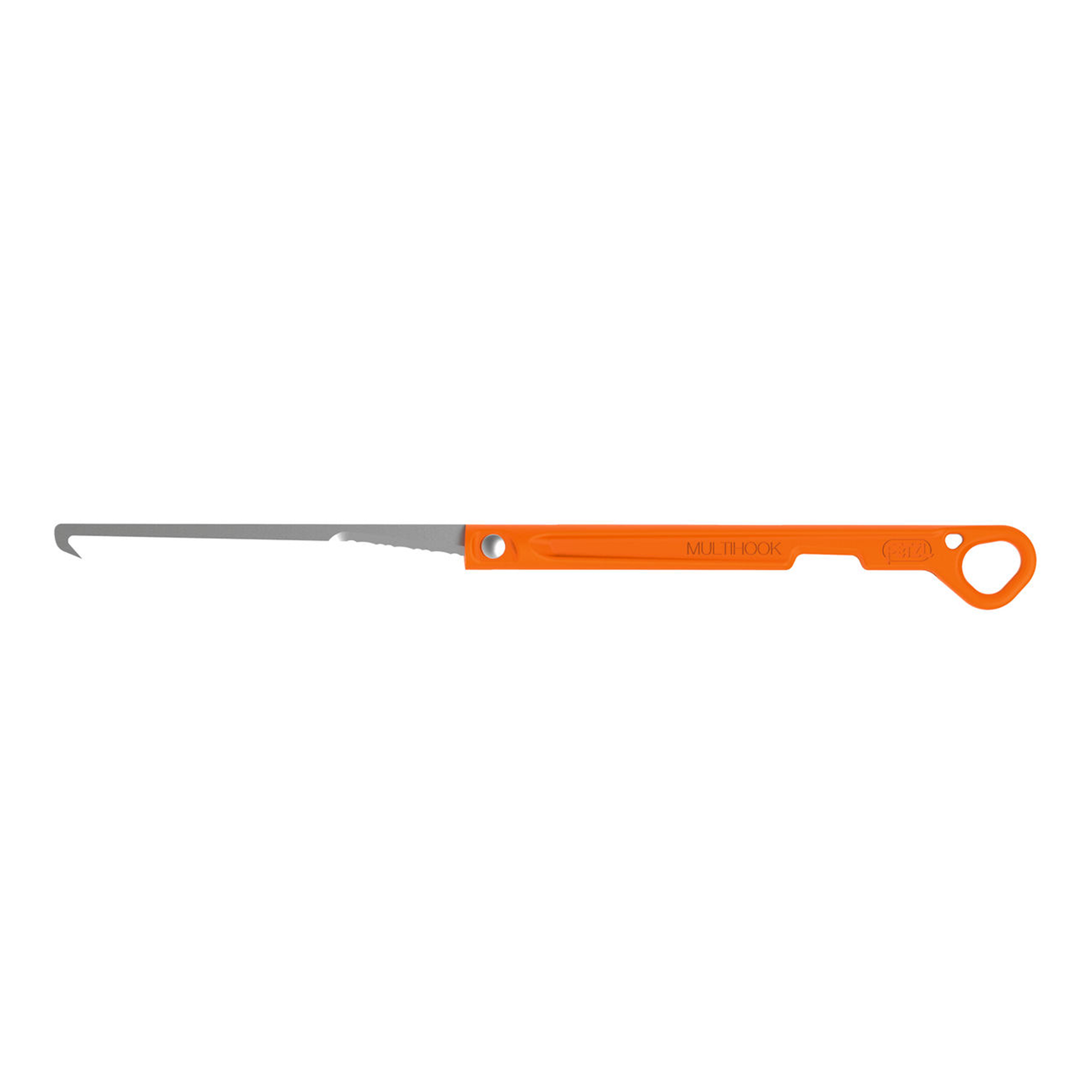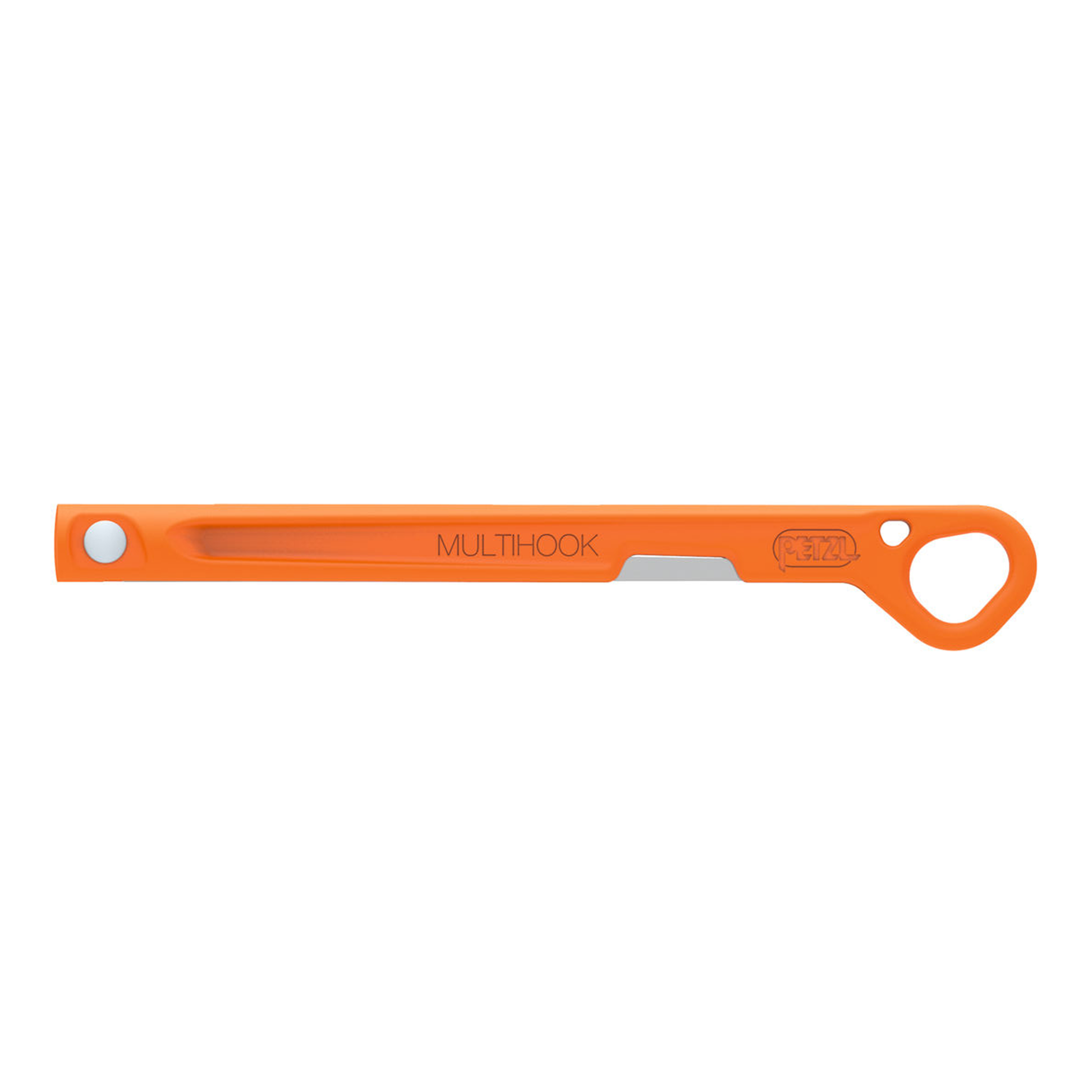 The Petzl Multihook is a lightweight, versatile tool designed for cleaning ice anchors, clearing clogged ice screws, and manipulating cord in rappel anchors. Its rigid, curved design allows for easy threading of Abalakov anchors (V-threads), while the integrated blade is ideal for cutting cord or webbing. The hook retracts into the handle for safe storage, and a clip-in hole allows for easy attachment to your harness.