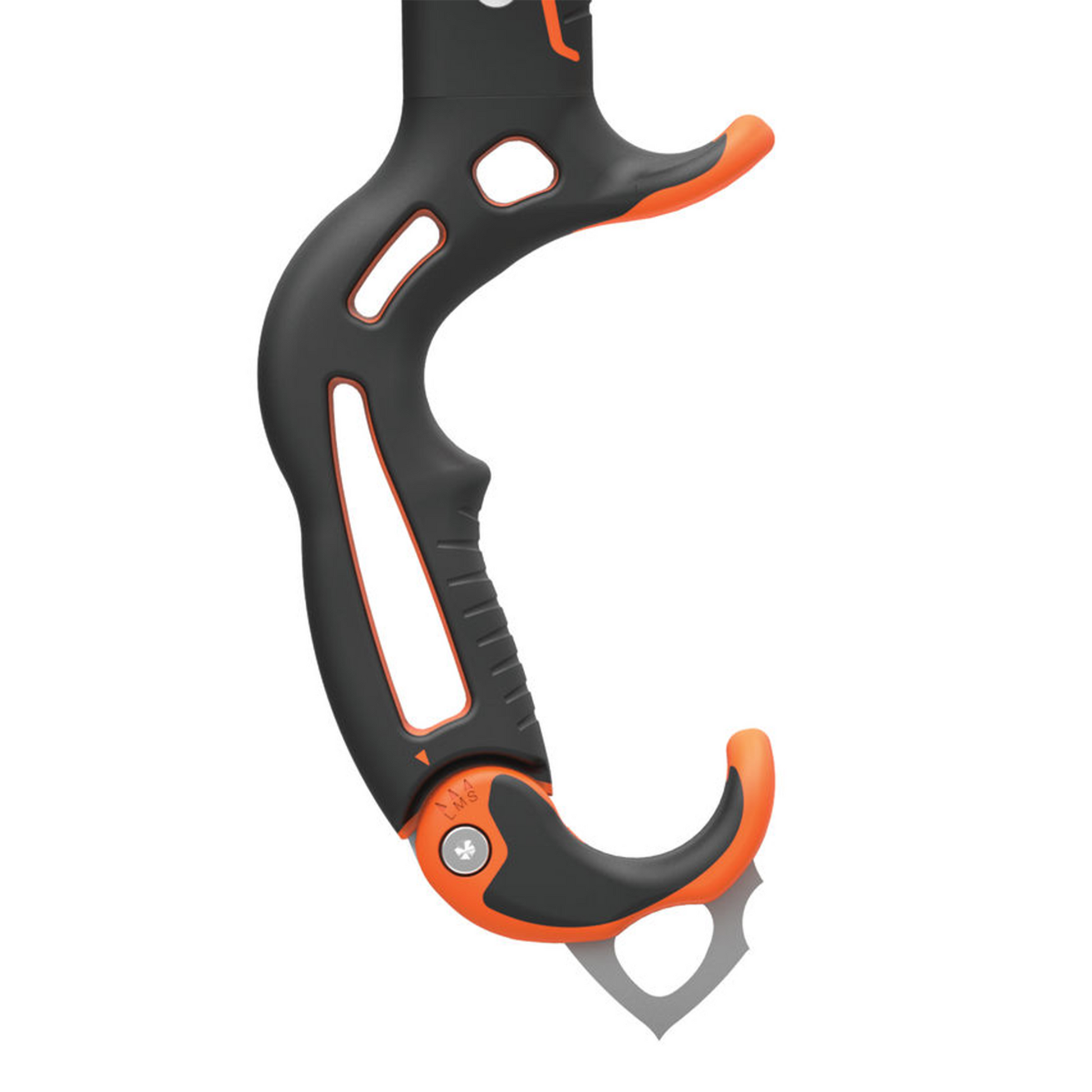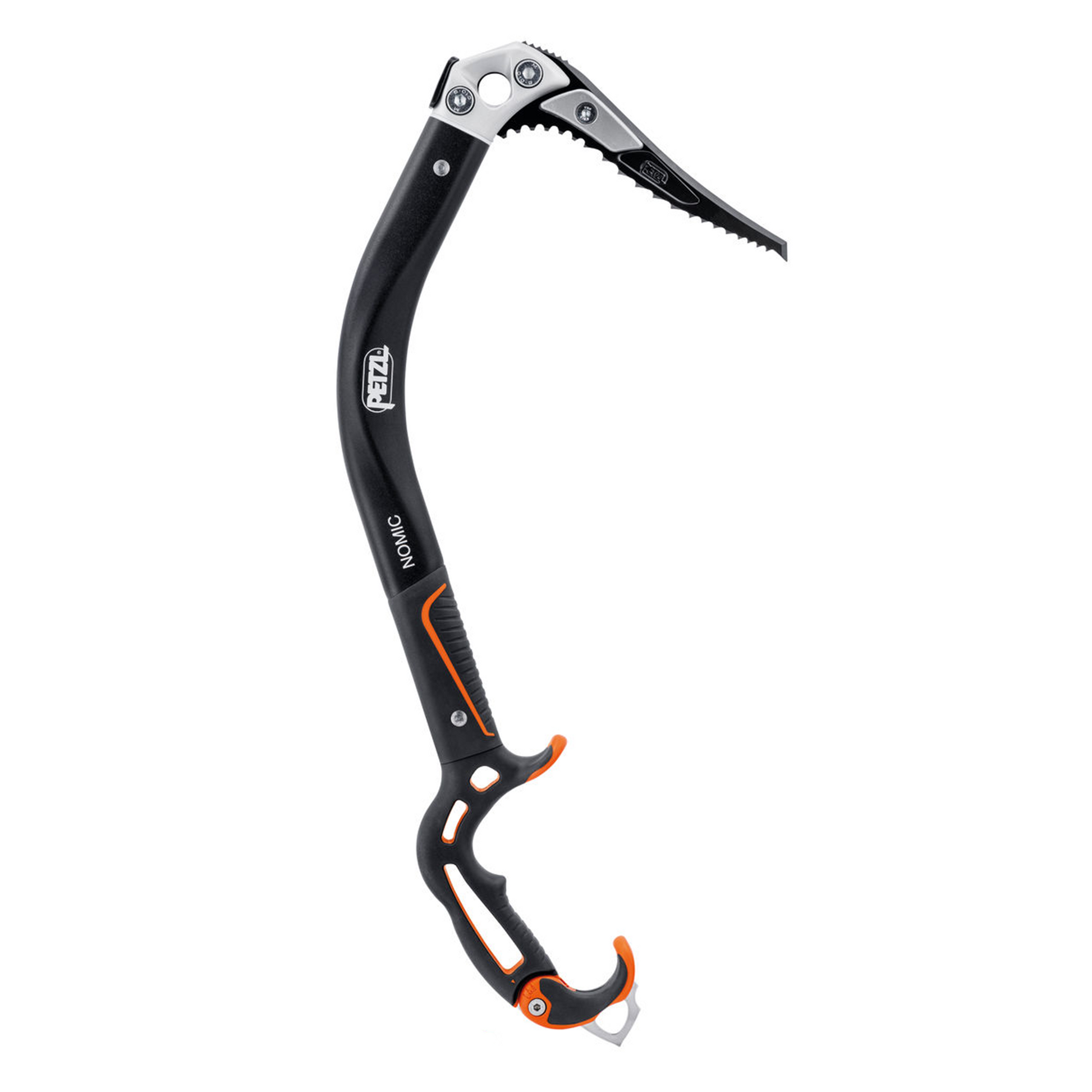 The Petzl Nomic Ice Axe sets the standard for ice climbing. A double handle design allows for multiple grip positions and stable hand switches, while the Pur’Ice Pick allows efficient placement in a variety of types of ice. Integrated pick weights improve precision and make it easier to slot into cracks, and the low-profile hammer lets you drive or reset pitons without adding bulk. Fully modular, the axe can be optimized according to the terrain.