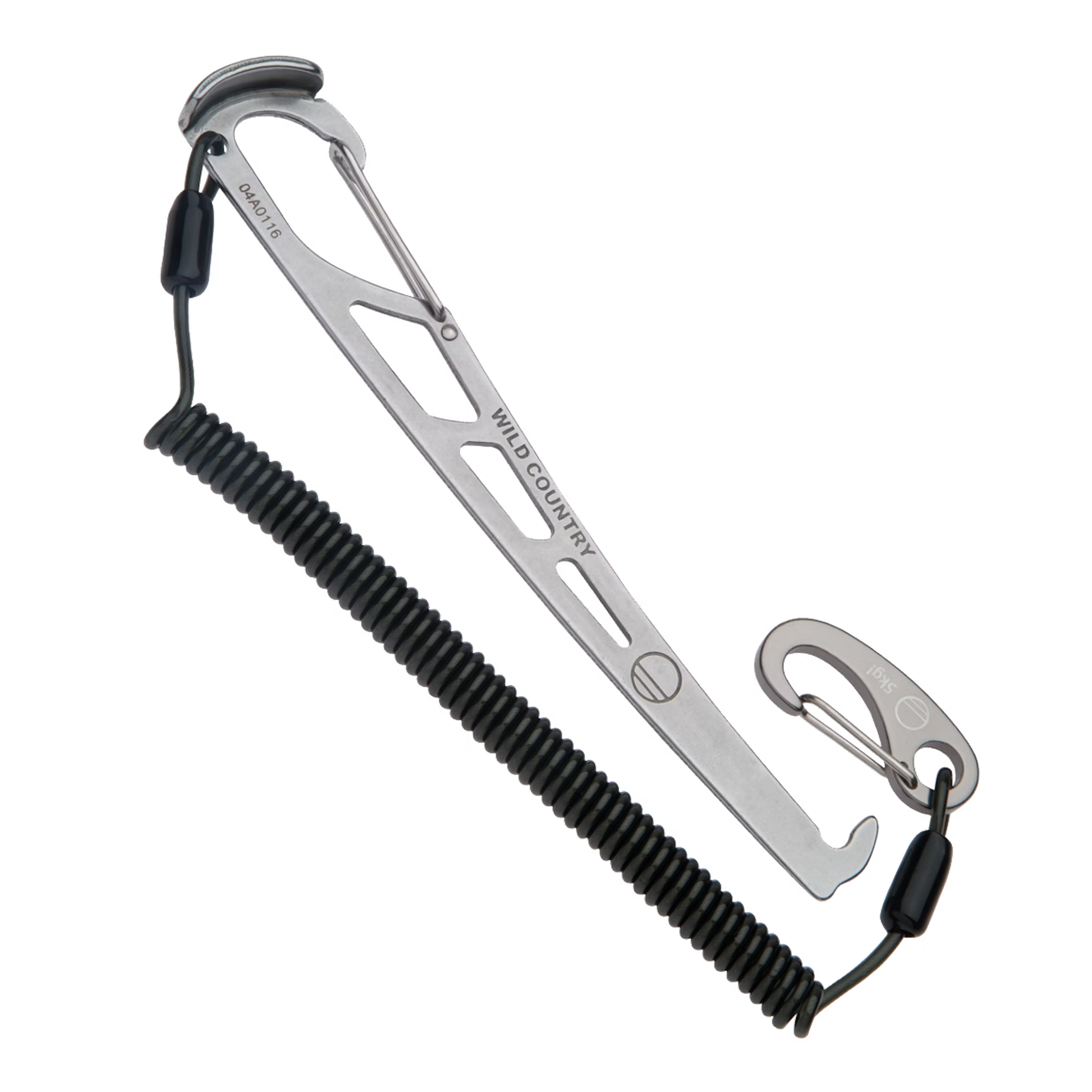 The Wild Country Pro Key with Leash is a thoughtfully designed, easy-to-use nut tool made for efficient gear cleaning. Built from lightweight aluminum alloy with cutouts to reduce weight, it features a precision-ground tip for tight placements and a wide, flat end for pushing out gear with your palm. An integrated wiregate clip lets you attach it directly to your harness, while the included extendable leash and mini carabiner prevent drops when working in awkward spots.